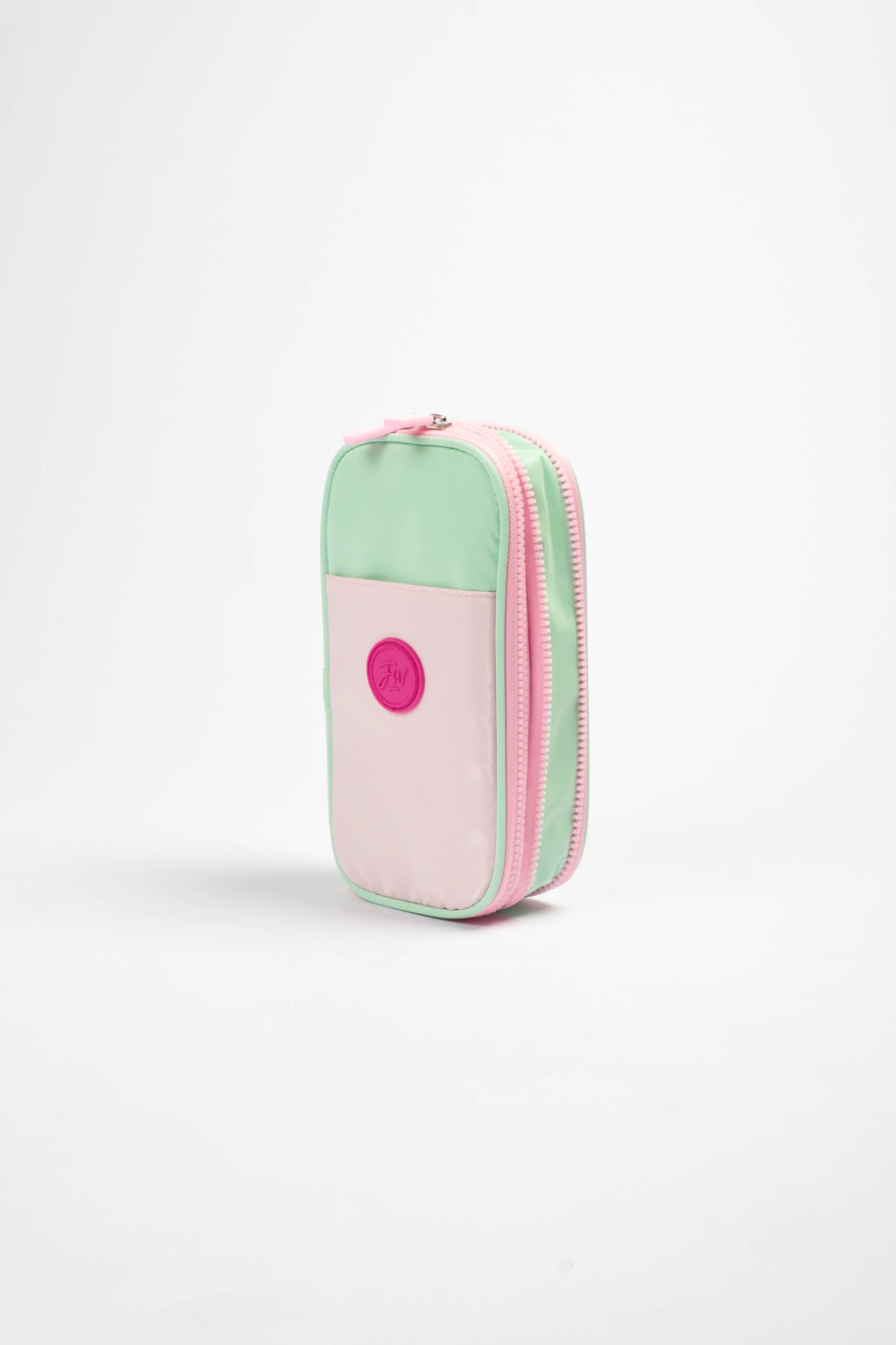 Bolsillo externo. Compartimento principal con fuelle para ampliar la capacidad. En el interior cuanta con un bolsillo de red con cierre, un divisor con espacio para 6 lápices y comparti- mento de amplia capacidad.